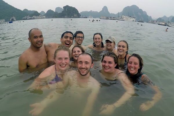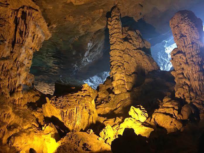 I can finally say I have been on a cruise! We spent the weekend in Halong Bay and were guests on Majestic Cruise. The bus ride is about three hours from where we are currently staying in Long Biên. On the way over we were all singing oldies songs and looking at all the new surroundings out the window. It made the bus ride go by quickly. When arriving, we docked Majestic Cruise and were greeted with welcome drinks and keys to our rooms. We settled in for about 10 minutes before eating lunch. There was so much food, I am not even sure how many courses it would be considered. Food just kept being brought out to us. After lunch we had about 30 minutes to digest the food before taking a smaller (tender) boat to Hang sửng sốt where we hiked to get views of Halong Bay and walk through the caves. This was so incredible! I didn’t even know the caves existed. We went back to the cruise liner then headed out to go swimming and more hiking. Some of us did the additional hike to the top. Nearly breathless and contemplating giving up halfway, I made it, sweaty and panting as all hell.
